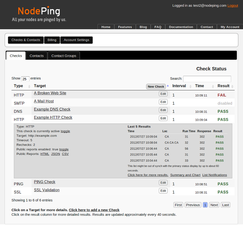 NodePing provides website and server availability monitoring. At its most basic, the service lets users enter a list of addresses of web site addresses or other Internet based services, and then checks to see if that site or service is responding properly. If a web site or other service does not respond correctly, the service automatically notifies someone by email, SMS, voice, Pushover, twitter direct message, etc. Results are stored in our databases so they're available for reports. Using the service for basic web site monitoring is very easy, and only takes a few minutes to set up and get your first results. Then the goal is to make it take as little attention from you as possible, so you can mostly ignore it unless something needs attention. After all, that's a big part of what server monitoring is for. The service is designed to be very easy to use, and to make it very easy to get the information you need about your sites and systems. If you are just getting started, we suggest you go to our Getting Started page and jump right in.