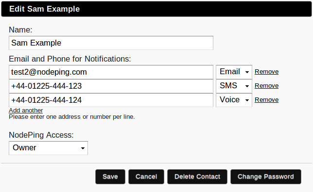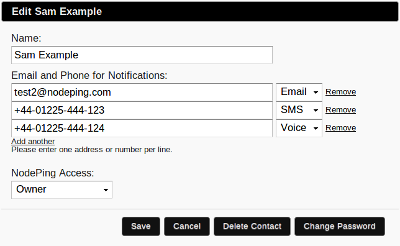 Contacts have two uses in NodePing. They are used to manage notifications. They are also used to manage access to your account on the NodePing web site. You can give different contacts different access levels, depending on whether you want them to just receive notifications but not login, view account information and results, or manage your monitoring checks and contacts.